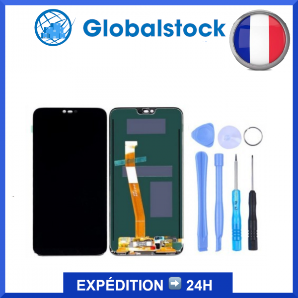 Vitre arrière avec Adhésif + Lentille camera + support pour Huawei Honor 10 Bleu + Logo